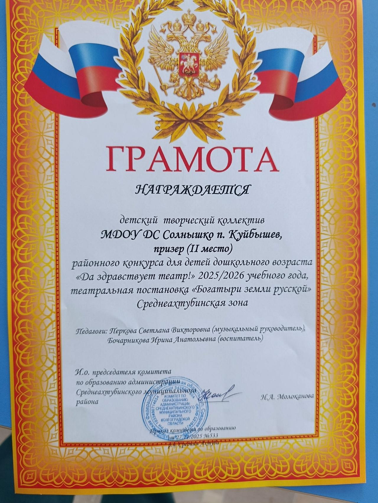С театральной постановкой "Богатыри земли Русской" наши маленькие артисты смогли покорить сердца зрителей и жюри в Среднеахтубинской зоне, заняв достойное 2 место!